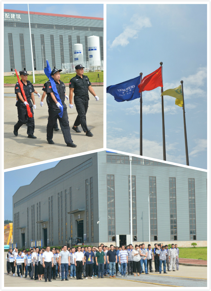 升旗仪式庄严的进行! 升国旗,奏《国歌》,行注目礼! 升园区旗、安全旗,奏《金强之歌》,行注目礼!