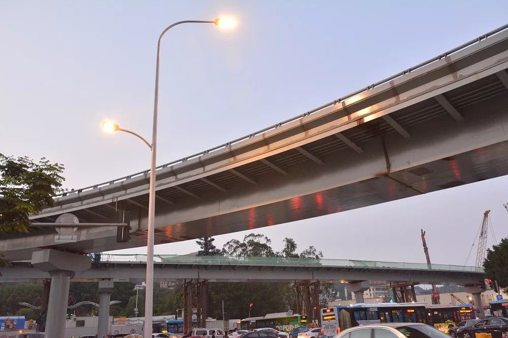 项目采用博那德装配式钢结构系统—钢箱梁结构,构件在工厂预制后,经复测验收合格,分段运输至现场进行吊装。钢箱梁结构与传统的混凝土桥梁相比更适用于造型复杂、主线与匝道层叠过多处。由于采用钢材承重,比现浇混凝土量自重较轻,构部件为工厂预制,缩短现场施工工期,减少现场施工垃圾、噪音等,对环境影响较小。采用钢箱梁结构,全部使用钢材,便于质量控制和后期维护。