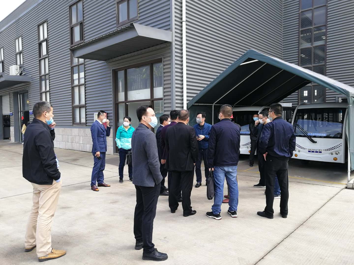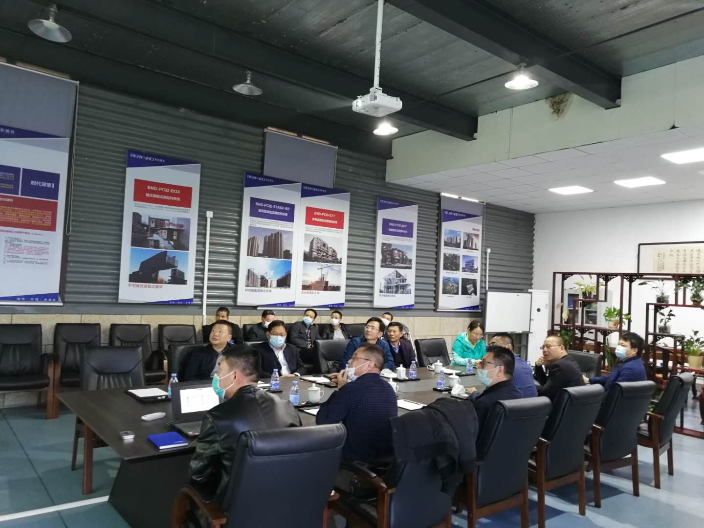 在博那德,双方召开座谈会,来访领导听取了博那德科技公司概况以及在建的三营澳大桥项目制造安排的介绍。省安公司总经理丁文婓表示博那德园区整体管理比较规范化,三营澳项目在质量管理体系、安全保障以及技术提升上,准备工作做得比较充分。最后,提出了关于疫情期复工,在做好防疫工作基础上复工复产,加快施工进度的建议。
