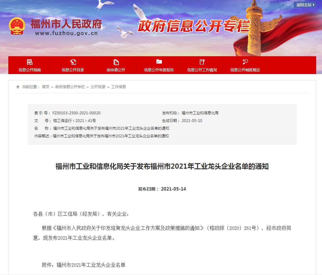 近日,福州市工业和信息化局公布了2021年福州市工业龙头企业名单,博那德科技榜上有名,荣获福州市工业龙头企业。