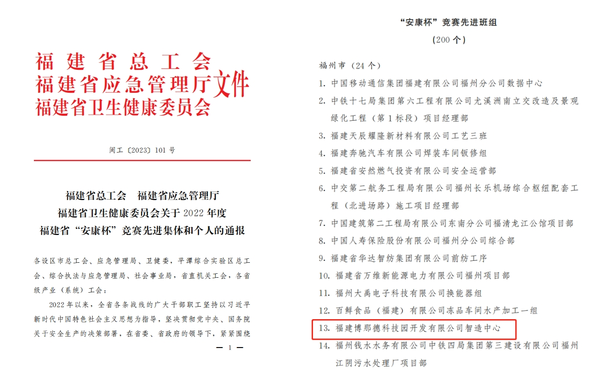 2023年9月13日,福建省总工会、福建省应急管理厅、福建省卫生健康委员会联合印发《关于2022年度福建省“安康杯”竞赛先进集体和个人的通报》,福建博那德科技园开发有限公司智造中心荣获2022年度“安康杯”竞赛先进班组。