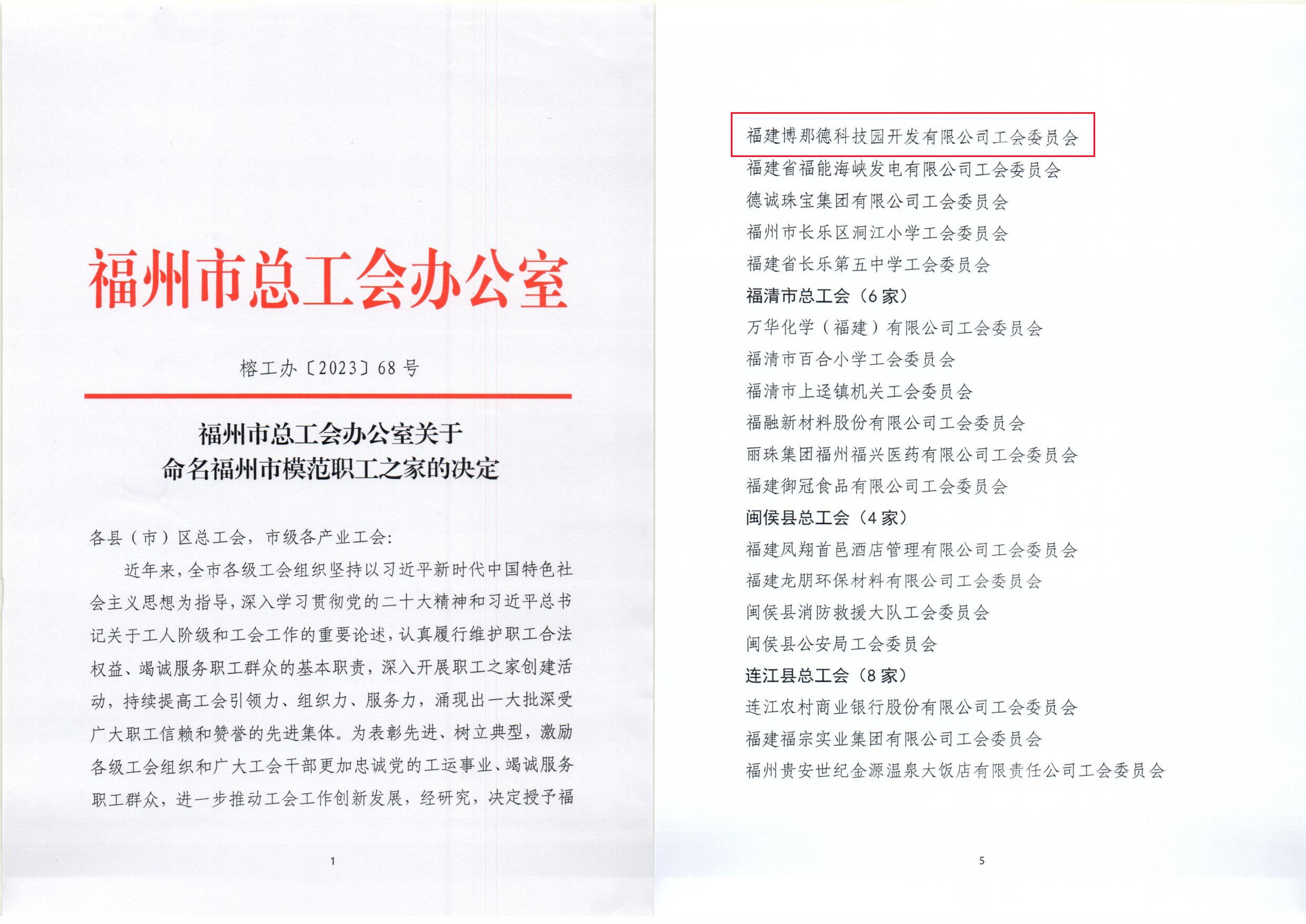 2023年11月27日,福州市总工会办公室发布《关于命名福州市模范职工之家的决定》,福建博那德科技园开发有限公司工会委员会荣获“福州市模范职工之家”称号。博那德工会自成立以来,在公司党支部的领导和长乐区总工会的指导下,深入贯彻学习习近平新时代中国特色社会主义思想,以党建引领工会工作,不断健全工会组织结构,完善工会相关制度,设立职工健身房、职工书屋、心灵驿站等服务阵地,并积极开展“植树节”、“端午节”、“中秋节”等职工集体福利活动,提升工会会员团结凝聚。