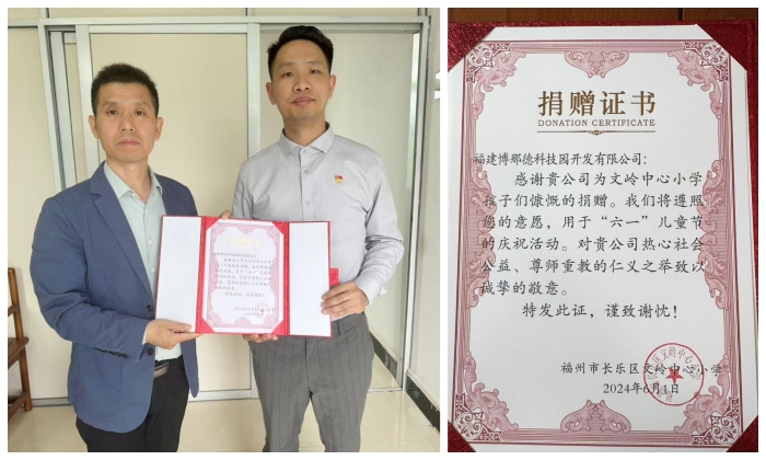 2024年5月31日,值此六一儿童节来临之际,中共福建博那德科技园开发有限公司支部委员会和福建博那德科技园开发有限公司工会,为文岭中心小学的孩子们送去节日祝福,并现场捐赠3000元,助推乡村教育高质量发展,以实际行动践行企业的社会责任和担当。