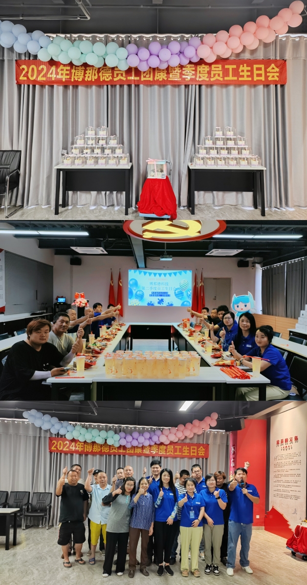 2024年7月15日,阳光正好,微风不燥,博那德科技在二楼党建室举办2024年第二季度生日会。精致的蛋糕、贴心的礼品、琳琅满目的零食,不仅装点了这场盛宴,更让空气中弥漫着温暖、活力与热烈的节日氛围。