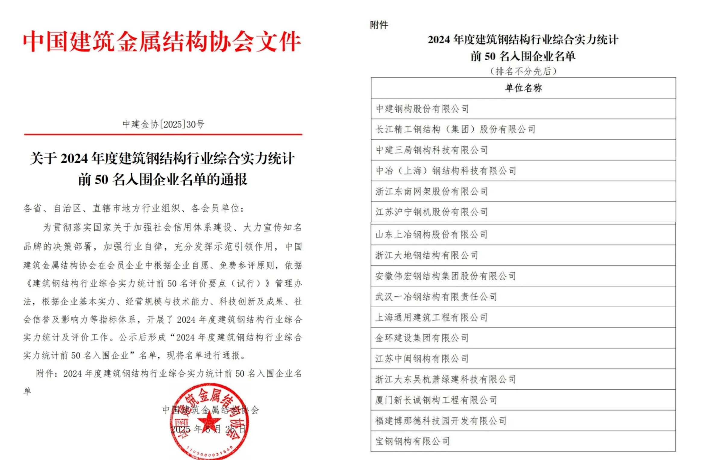 2025年5月26日,中国建筑金属结构协会公布2024年度建筑钢结构行业综合实力统计前50名入围企业名单,福建仅2家企业入围,博那德成功跻身。
