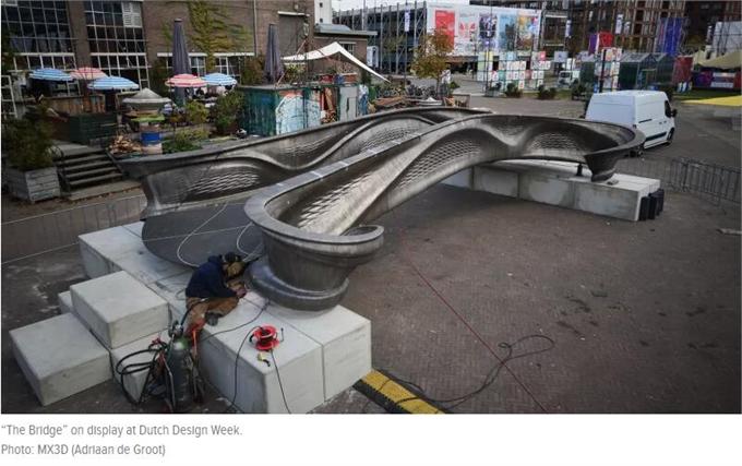 荷兰MX3D公司的团队最初计划在运河上空中建造荷兰设计师Joris Laarman设计的桥梁,但后来团队选择在远离行人的受控环境下建造,科技博客Gizmodo表示现在已准备好开始在阿姆斯特丹著名的德瓦伦红灯区完成最后的安装。安装完毕的3D打印钢桥由有机的钢铁曲线连接,线条完美,已准备好在设计周上展出。