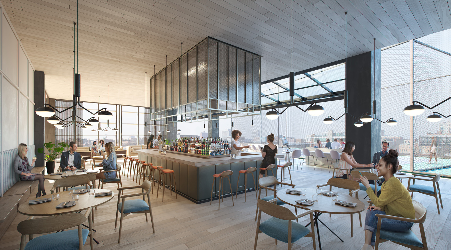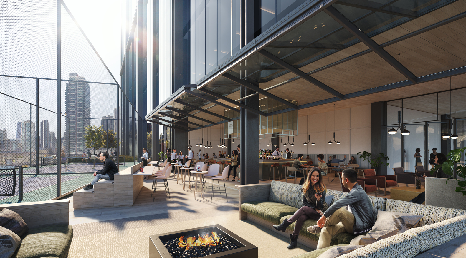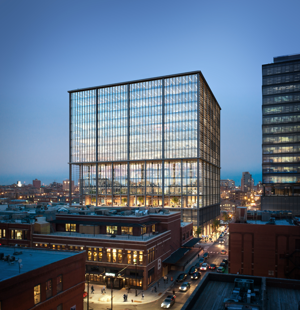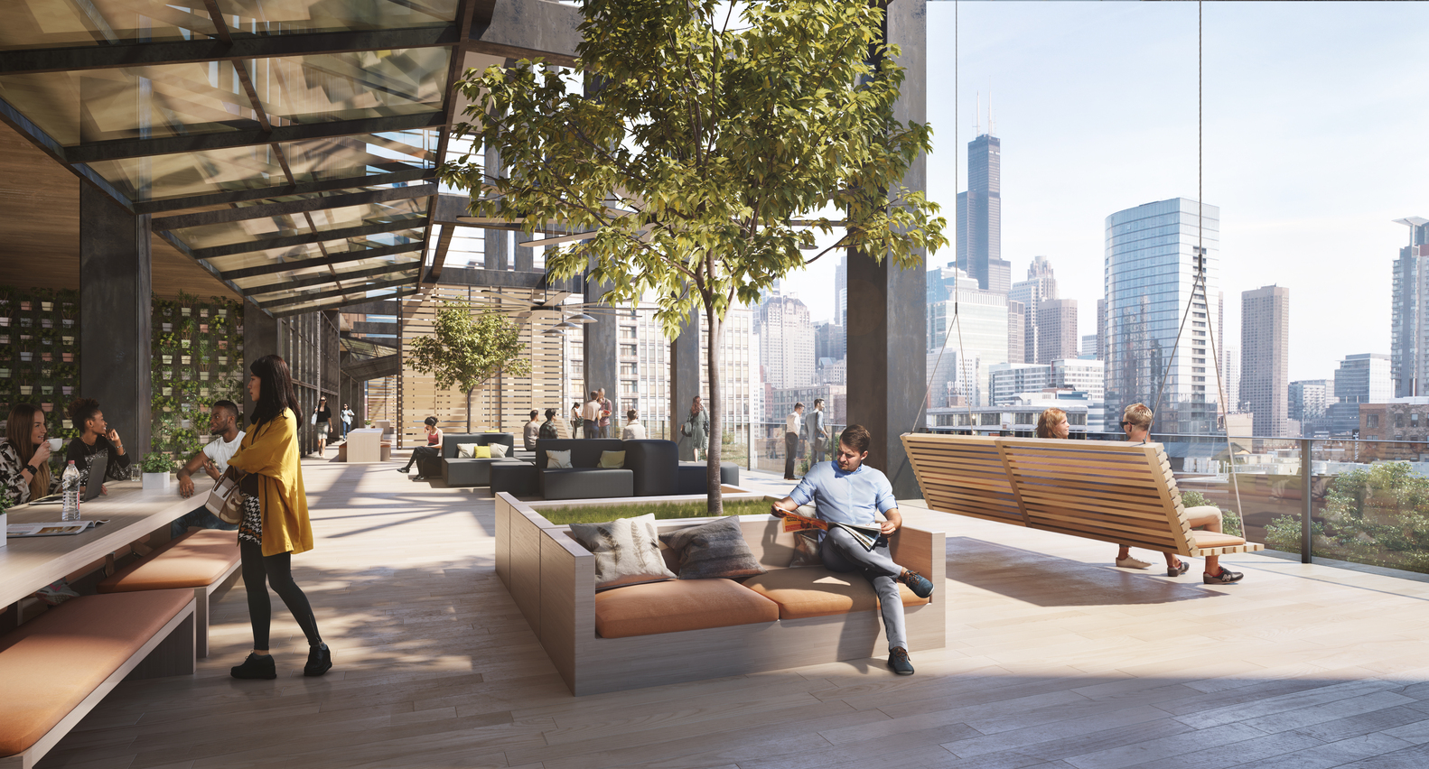 该方案的一个重要组成部分是位于五层楼的露天平台,可以通过折叠的玻璃幕墙俯瞰芝加哥的西环。其他的户外空间包括一个7700平方英尺(715平方米)的健身平台,有桨式网球场和一个6000平方英尺(550平方米)的室内室外租户休息室,拥有观看在整个城市的开阔视野。一层将整合附近2.5万平方英尺 (2300 平方米) 的零售空间。