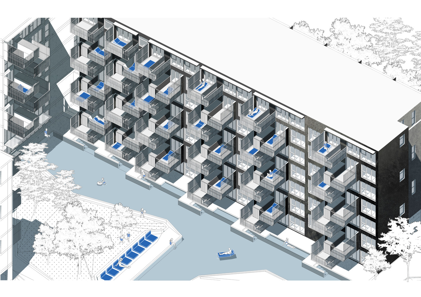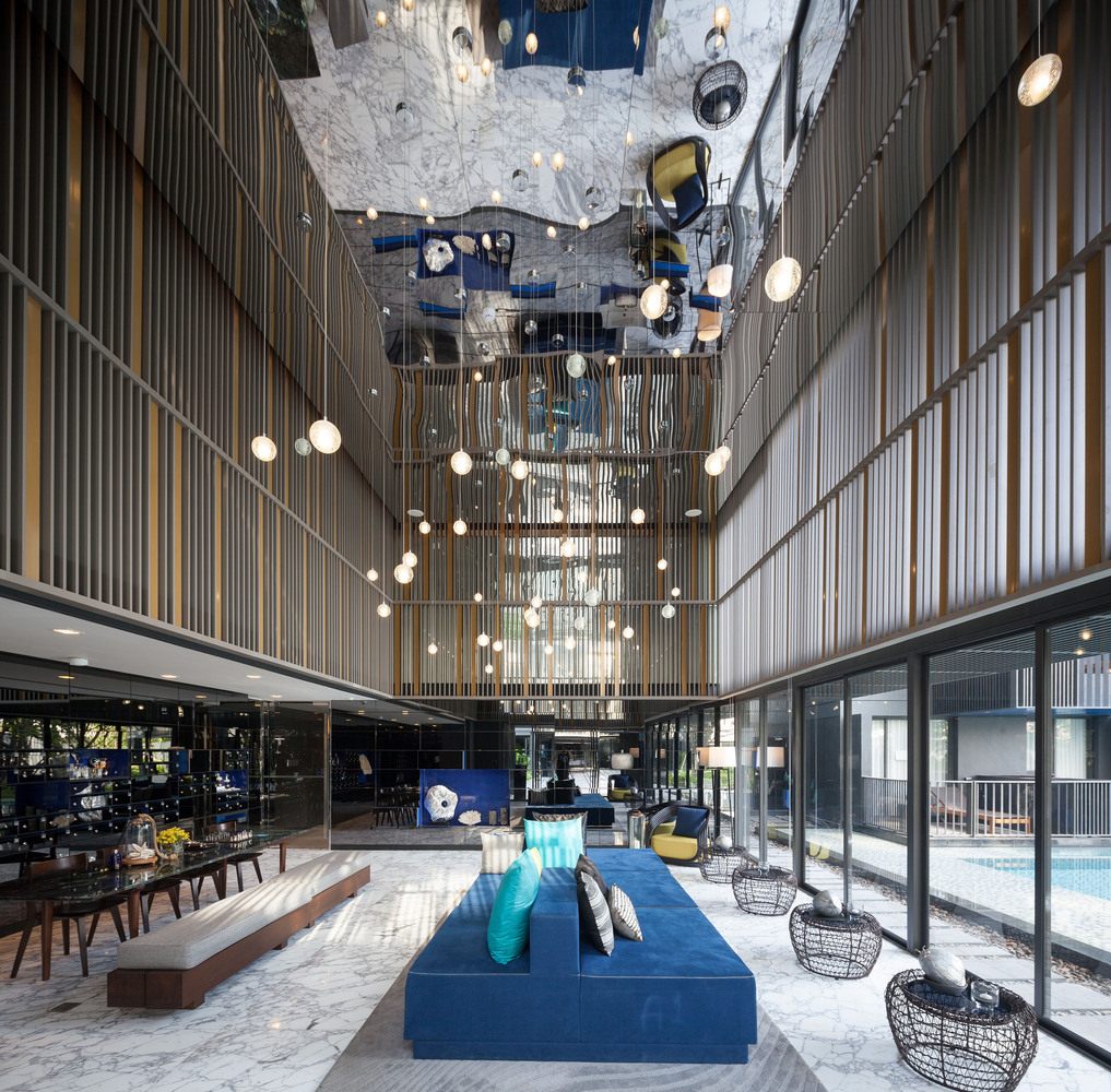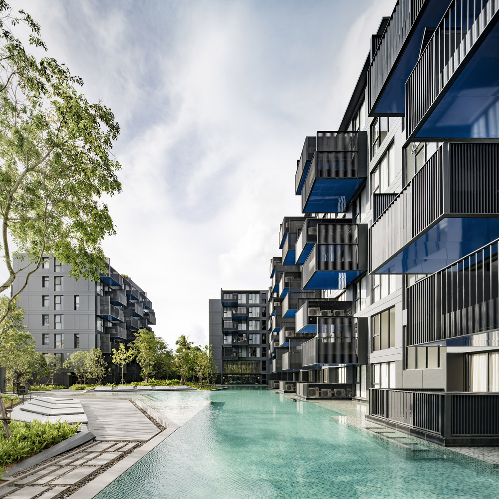 为了与地形的独特形状配合,两栋楼的轴线与指向安达曼海的场地平行。在前栋楼,在屋顶上的无边际泳池为人们带来了震撼的海洋全景画。同时在后栋楼,一个在地面上的大泳池是所有设施的中心,也成为两楼相连的桥梁。每个单元间都设有落地铝窗,每套公寓的宽度也长于它的深度。正因如此,这样的比例使得自然光可以到达室内的最深处。并且,每间的卫生间都位于外立面窗户旁,以得到足够的光照和通风。