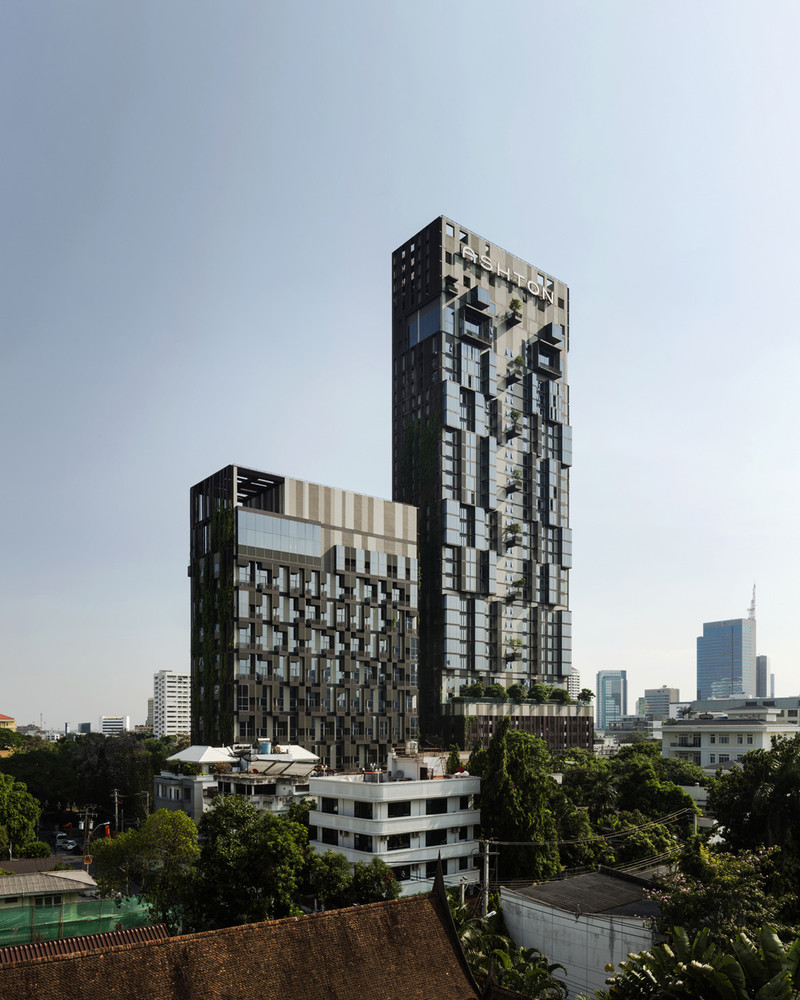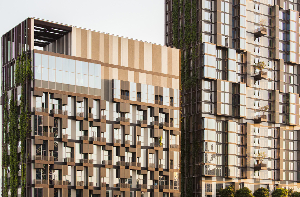 两座塔楼在视觉上通过折叠的“树皮”外围护结构相连,“树皮”包裹着后面32层高的塔楼(Ashton)和前面10层高的复式塔楼(Skyle)。这层外表皮由预制混凝土板、膨胀金属网和植物结合而成,表皮不但能遮阳,还能遮挡空调。西侧和东侧的“树皮”根据热带阳光的照射方向,策略性地被设计成绿色墙体。前后两座塔楼的绿色墙体高度分别为65米和130米,为住户和周边居民提供了舒适的视觉环境和自然环境。