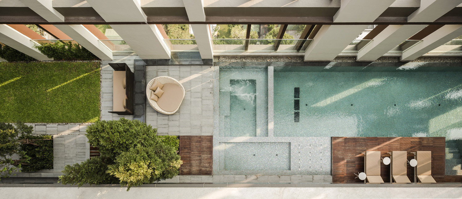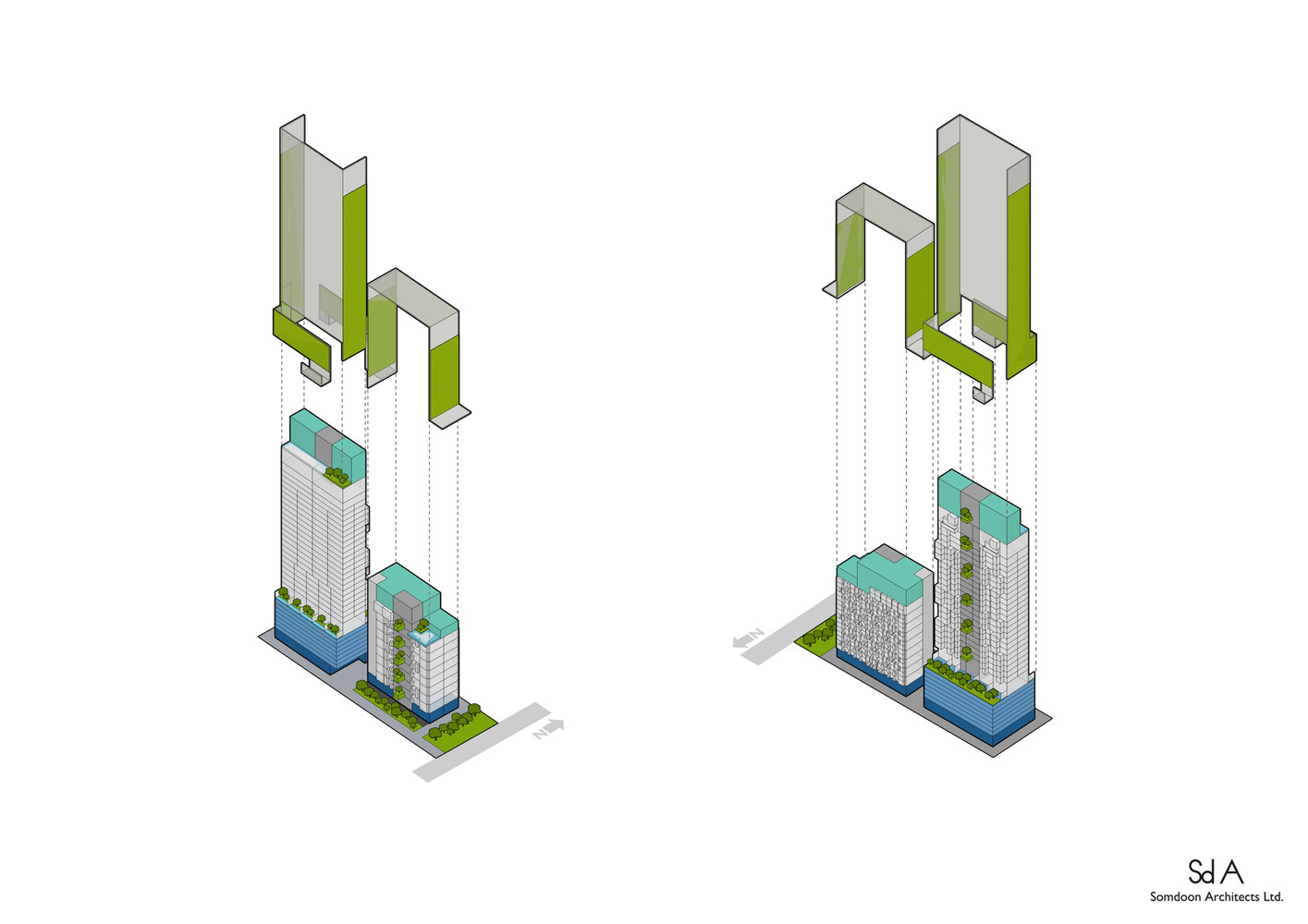 本案项目远离高密度区域和素坤逸路的拥堵,处在一个令人心情愉悦的、绿意盎然的低层住宅区之中。这个开发项目被分成两座塔楼,最大限度地增加了容积率,两座塔楼分别面向不同的潜在租户。